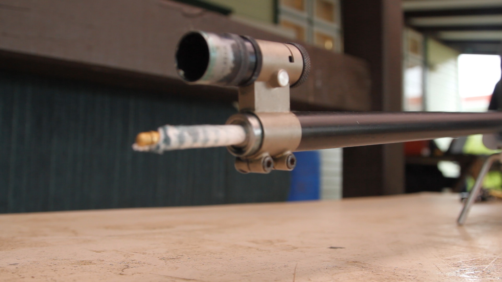 I sauntered onto the mound and set up camp in the dry Jared-shaped silhouette on the mat. While swapping stocks and sights over, I discovered rain-related problem #2… keeping my sights dry! I found a solution to this problem quite quickly. I keep my sights in a little drawstring bag to protect them – I just leave this bag on while I set up and get into position. Once the sights are safely sheltered under the umbrella of my hat, I can whip off the bag and shoot.
